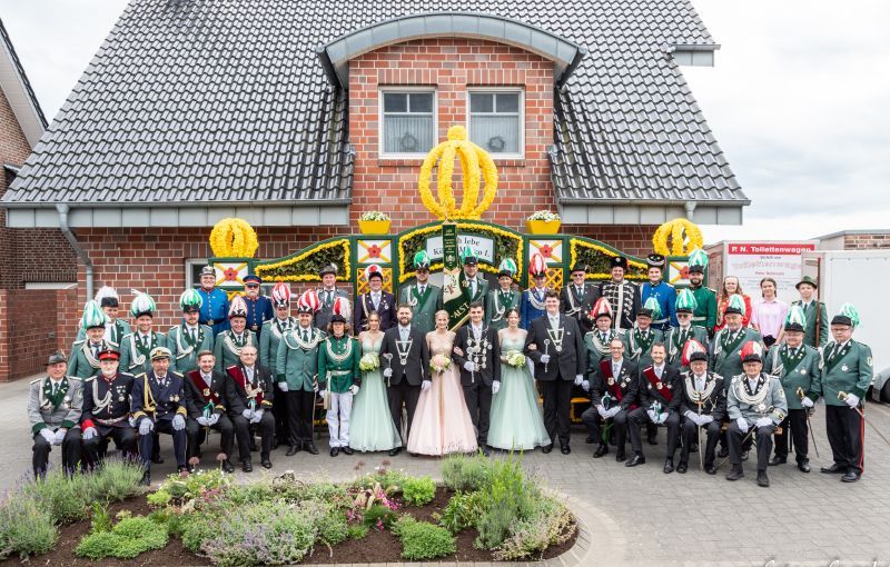 vordere Reihe: Günter Moll (Major Jägeroffiziere), René Drieskes (Oberstabsarzt), Sven Janssen (Hauptmann), Patrick Houben (Hauptmann), Norbert Thönnessen (Oberstleutnant), Robert Ahle (Major), Thomas Lücke (Oberstleutnant), Kai Schumacher (Königadjutant), Lilly Petter u. Paul Lappen (Ministerpaar), Sina Klumpen u. Marco Novo Fernandez (Königspaar), Alina Das u. Paul Rölkes (Ministerpaar), Georg Boers (Oberst), Karl-Heinz Lennackers (Hauptmann), Matthias Smit (Hauptmann), Heiner Meevissen (Hauptmann), Heinz Werner Görtz (Hauptmann), Franz Josef Birkmann (Oberleutnant)