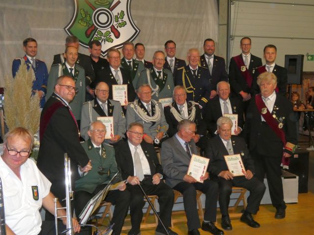 hintere Reihe: Steffen Segatz (Laudator), Marius Hauser (Orden Stufe I), Alfred Rixen (Orden Stufe III), Peter Hoffmanns (25 Jahre), Robert Peltzer (25 Jahre), Christian Ossowski (25 Jahre), Karl-Heinz Lennackers (50 Jahre), Michael Ossowski (25 Jahre), Heinz-Willi Optenplatz (50 Jahre), Peter Baldus (25 Jahre), Frank Beeker (Orden Stufe II), Ingo Melchers (Laudator)
